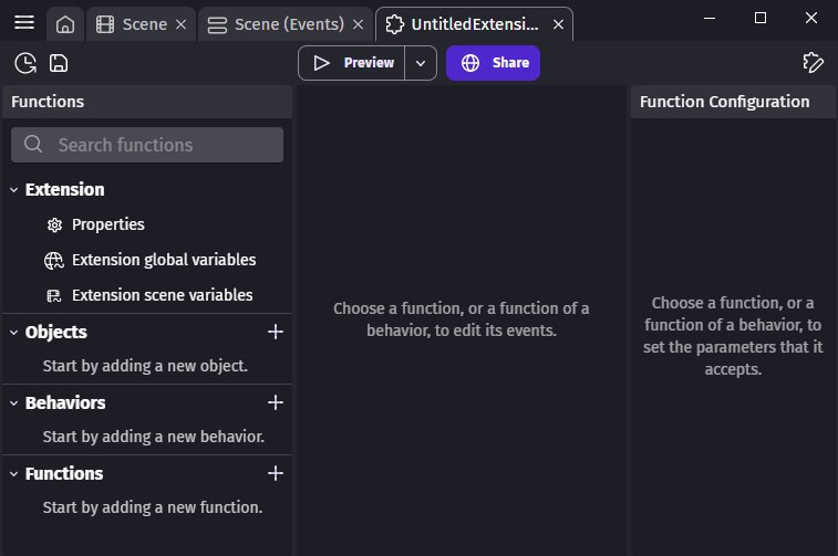 Variables can be useful within functions for intermediary results or to keep a state in the extension. You can declare new variables that are accessible only inside the extension by clicking on Extension global variables or Extension scene variables.