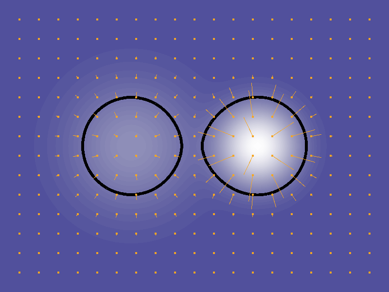 Liquids or blob effects can be made using contour lines. In the liquids example, each drop is a physics object with gravity and they collides with each other. One spike is added on the field for every drop. The action is called "Add disk" because its contour line makes a circle.