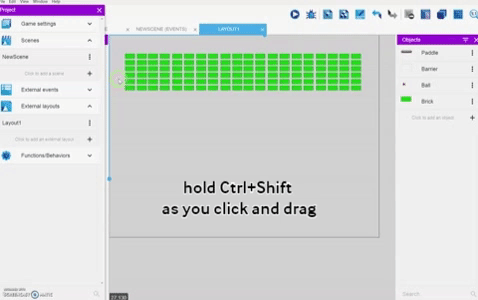 Scenes contain objects displayed on screen as game content. Each object you place on a scene is called an instance. Your breakout game will have several instances of the brick object on a game level scene. Scenes also contain events - actions that happen under specific conditions - to animate the scene.
